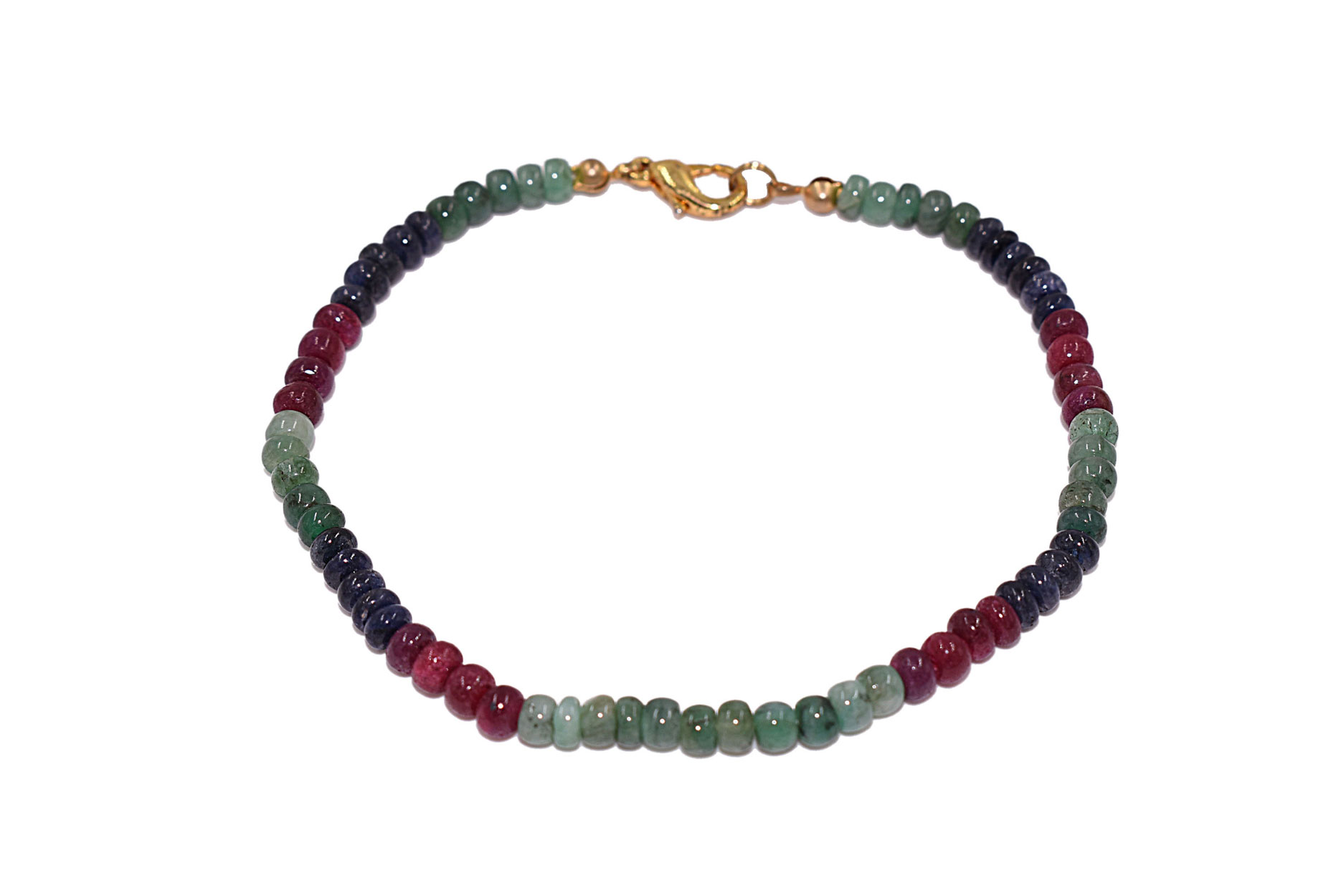 Beautiful, intensely colored necklace that combines the valuable gemstones emerald, ruby and sapphire.